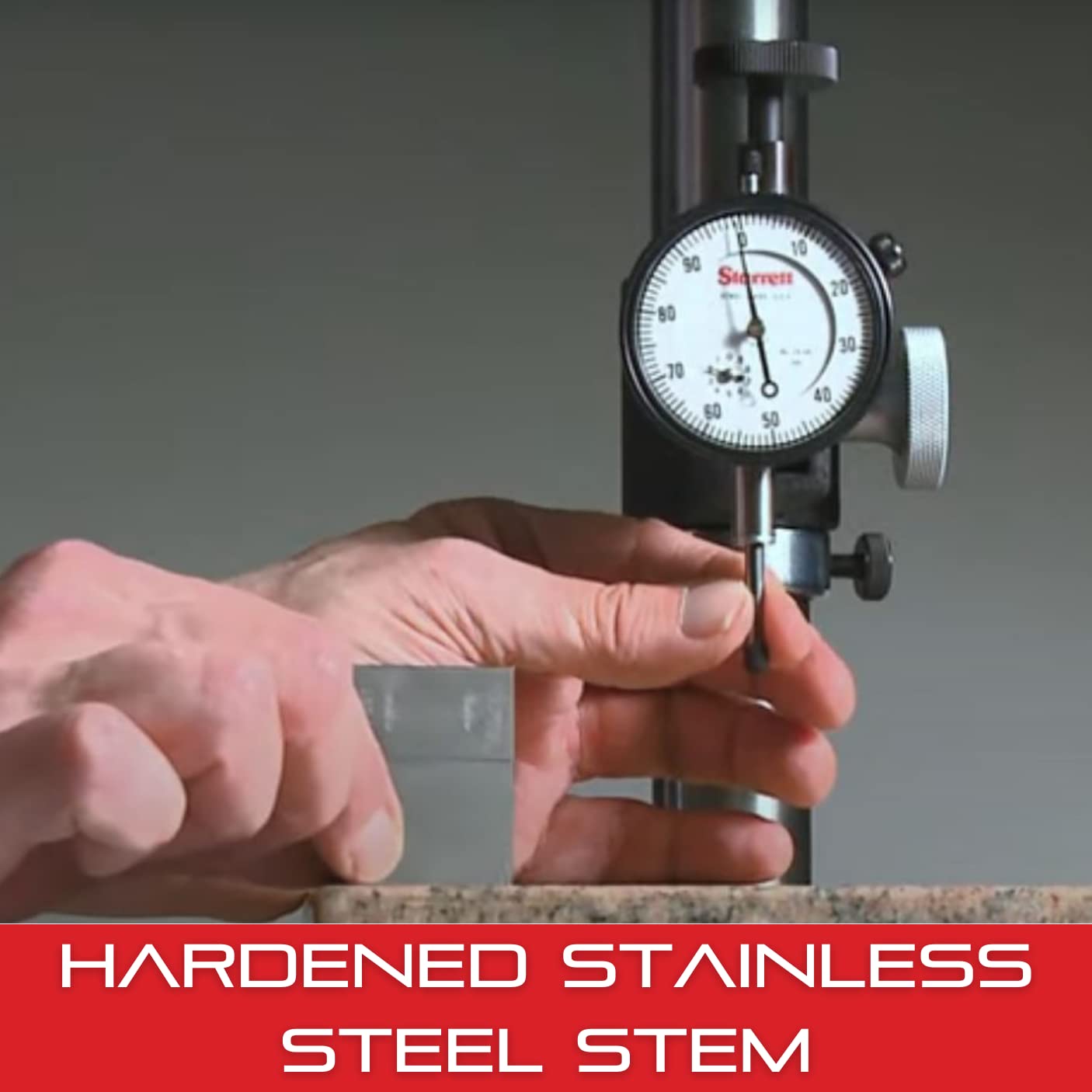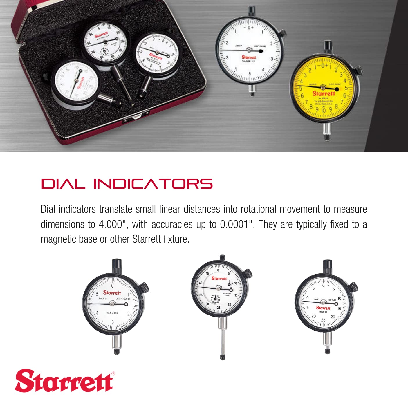 The Starrett 25, 655, 656 Series Dial Indicator with long range has a shockless, hardened steel gear train and is furnished with jewel bearings and lug-on-center backs. It is furnished with continuous reading double dial with direct reading count hands. It has rugged and simple unit construction with a universally fitting design, sharp bezel serrations for positive grip, unbreakable crystal, hardened stainless steel stem, pinions, rack and spindle, no-glare satin finish on case, a massive bridge for rigid bearing support, and non-reflecting white eggshell finish on dial. It conforms to AGD specifications except for range. Stem cap supplied as standard. It has a 3.000" range, dial reading of 0-100, and .001" graduations.