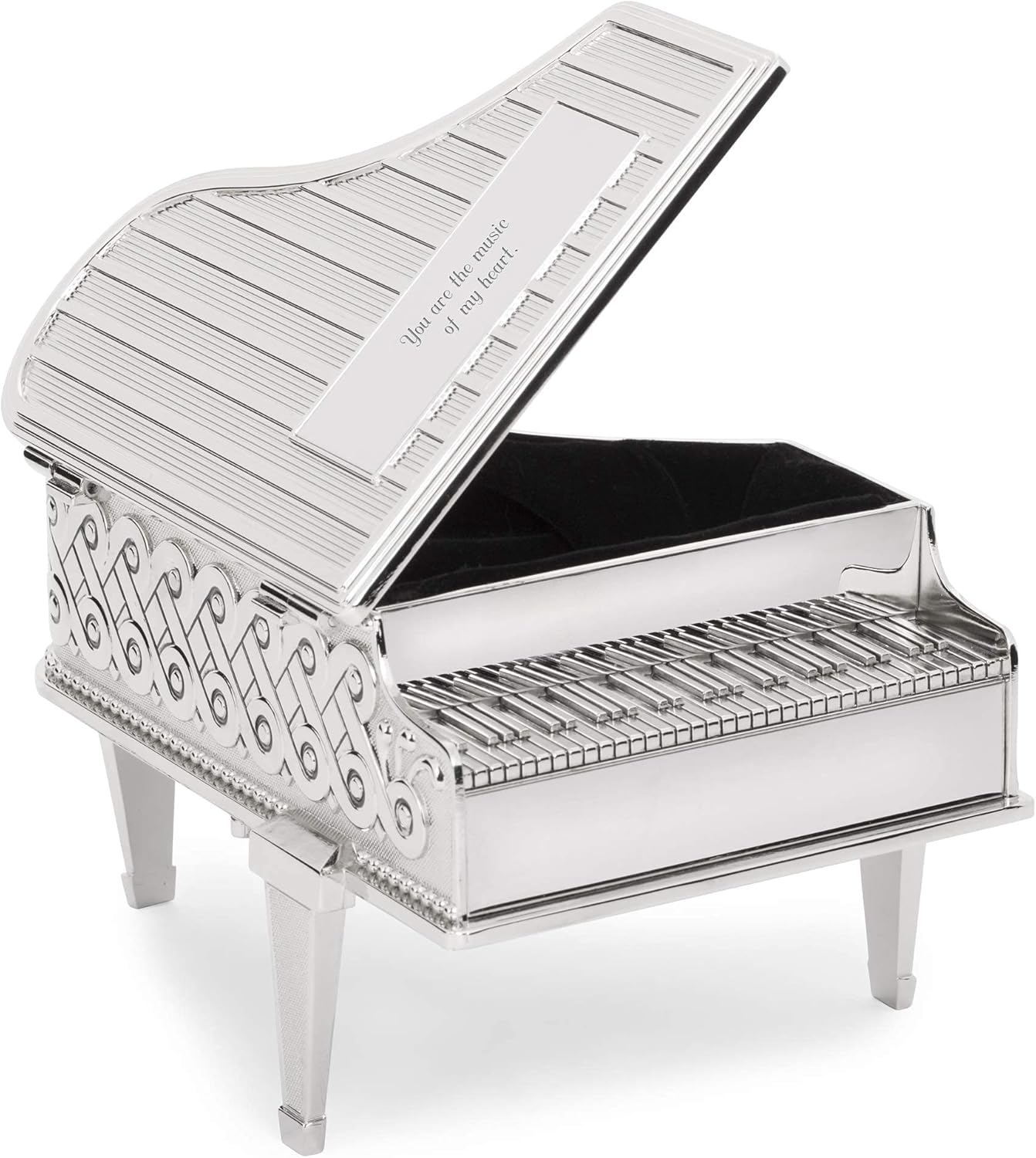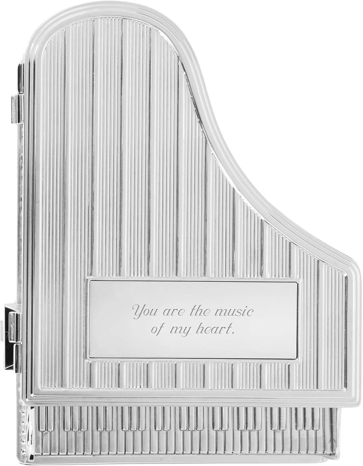 This Things Remembered Personalized Silver-Tone Piano-Shaped Music Box is the perfect timeless gift for that one-of-a-kind lady. Intricate designs surround the piano and, when opened, a lush velvet interior is revealed. When wound, this gorgeous gift plays “Fur Elise.” Engrave the plate with a name, initials or a heartfelt message for no additional cost. -Size: 6"L x 4.2"W x 3.5"H -Material: Silver-Plated Zinc Alloy; Black Velvet -Music: Plays “Fur Elise”