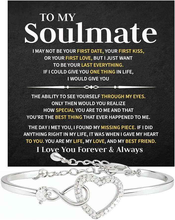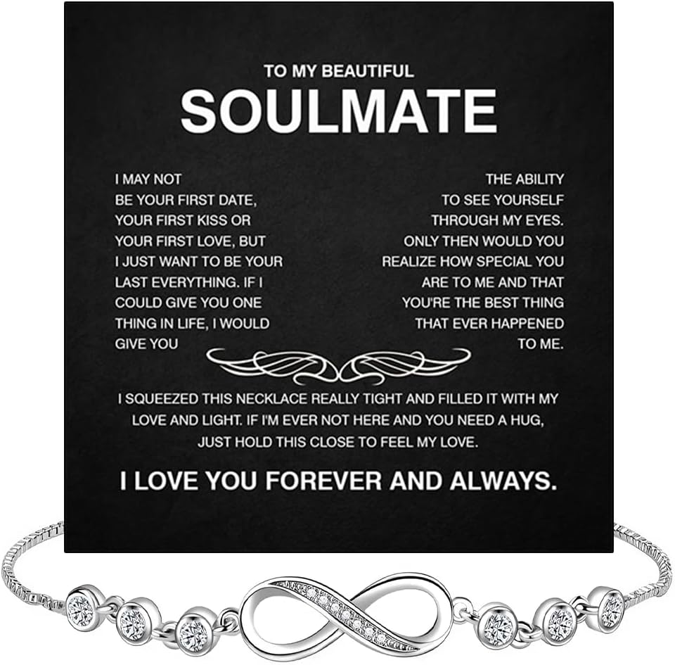 Celebrate eternal love with this beautifully crafted "To My Soulmate" bracelet set. This set includes two elegant bracelets: one featuring a shimmering infinity symbol surrounded by sparkling stones, and the other showcasing a delicate heart intertwined with the infinity sign. Both pieces represent unbreakable love, deep connection, and lifelong commitment. Made from high-quality alloy with silver plating and cubic zirconia accents, these bracelets offer lasting shine and durability. The adjustable design ensures a comfortable fit for most wrist sizes, making it a versatile and thoughtful gift. Whether you're celebrating an anniversary, birthday, Valentine's Day, or just want to express your love, this soulmate bracelet set is the perfect choice. A meaningful gift for your wife, girlfriend, fiancé, or partner — a reminder that your love is infinite.