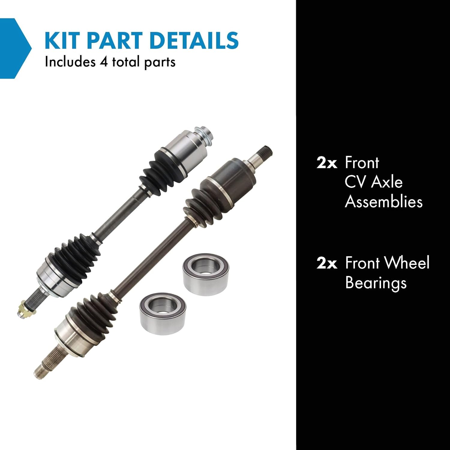 4 Piece Drivetrain KitKit Includes(2) Front CV Axle Assemblies(2) Front Wheel BearingsFitmentAcura TSX 2009 - Automatic Transmission Front 2010-14 - Base Model Automatic Transmission Front 2012-14 - Special Edition Automatic Transmission FrontHonda Accord 2008-12 - EX L4 2.4L Automatic Transmission Front 2008-12 - EX-L L4 2.4L Automatic Transmission FrontProduct AttributesQuantity: 4 PieceProduct Features 100% New: Manufactured to tighter tolerances for extended service life Upgraded Elastomer: Premium seals to extended service life Moly Greased: Specifically-designed grease shield to reduce premature wear Restored Performance: Refreshed steering system for improved road-feelItem DetailsTRQ drivetrain kits are manufactured using premium raw materials to restore original performance. Each TRQ drivetrain component is designed to be a direct, maintenance-free replacement to the stock unit. To extend the service life of your drivetrain, TRQ recommends replacing wheel hubs, bearings, and constant velocity (CV) drive axles at the same time to ensure even wear of components and improved ride comfort. All products are fit and road-tested in our Massachusetts R&D facility to ensure we deliver on our promise of Trusted Reliable Quality.Reference Numbers28052AA01044300-TA0-A5144300TA0A6244305T2AA5044305TA0A0044305TA0A5044305TA0A5144305TL2E5044306T2AA0044306T2AA5044306T3VA0044306TA0A0044306TA0A5044306TA0A50RM44306TL2E50447-50647R447-50648L447-61971R447-61972L51009566-425066-4251664250664251FW26HO8242HUB00087NCV36120NCV36121NCV36122WB000019WB510095WE60387