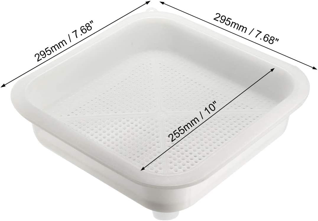 Specifications: Material: plastic, stainless steel Mounting hole diameter: 7mm/0.28 inch Inner plate size: 255 x 255 x 45mm/10 inches x 10 inches x 1.77 inches (L*W*H) Total Size: 295 x 295 x 165mm/7.68 inches x 7.68 inches x 6.5 inches (L*W*H)Description: This honey strainer is designed with two separating sieves for efficient filtration of honey. Easy to use and use, help for beekeeper to filter honey. Adopting stainless steel net and plastic construction.You can put the filter on the honey jar or barrel and pour the honey into the filter. Washed in warm water and hung to dry so you can use it again. Ideal for filtering honey, easy to use and reusable.