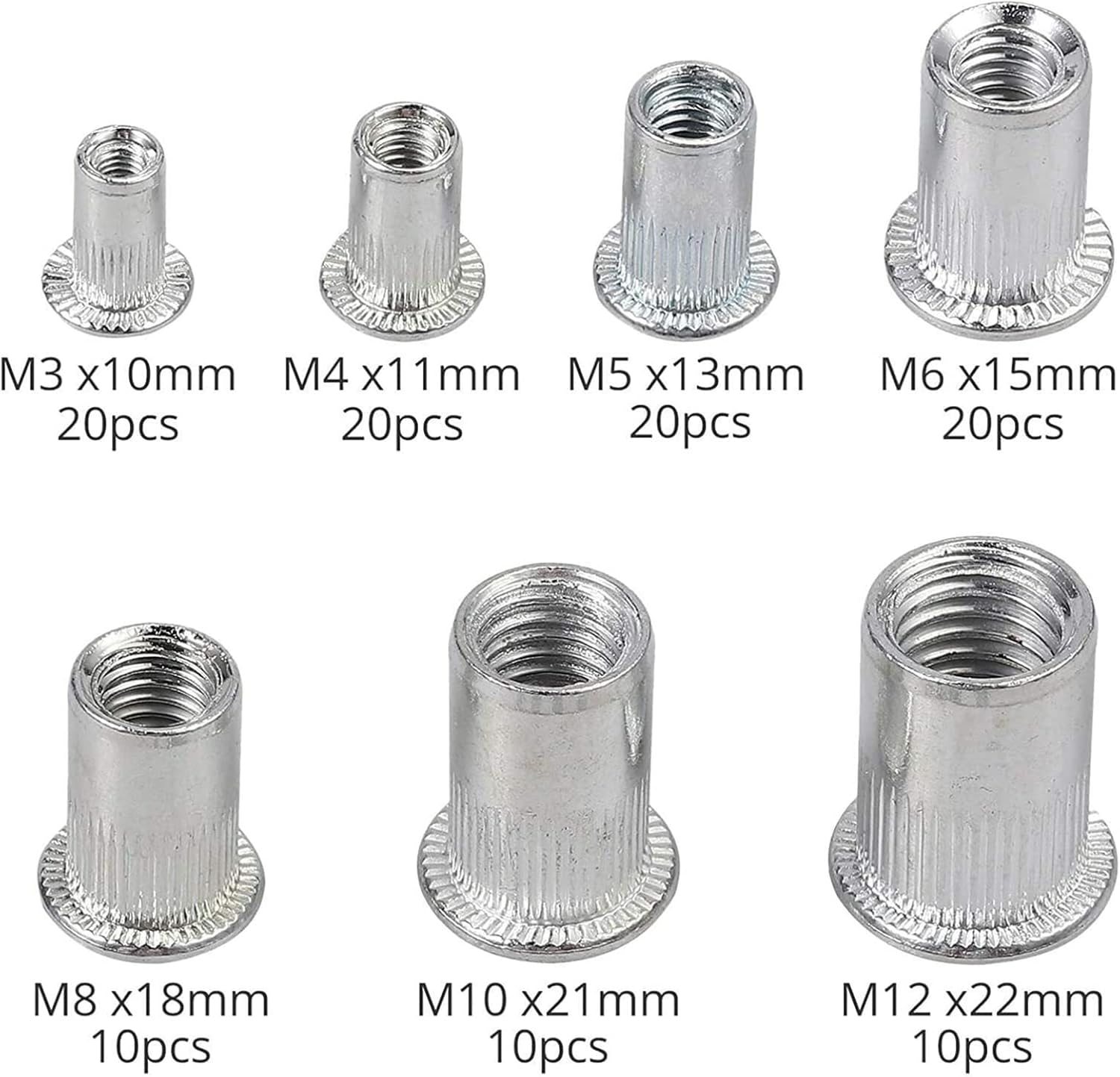 Product description: Package Includes: 1 x 13’’ Hand Riveter 1 x Wrench to change mandrel 7 x Mandrels 7 x Mandrel Heads 110 x Rivet Nuts 1 x User Manual Tips: 1.Please use small force to operate small rivet nuts. 2.We advise new users to practice some rivet nuts alone before you really apply them to your projects. 3.Please reserve space to operate the rivnut tool. When the handles are fully opened, the distance between the two handles is 45cm/18’’.